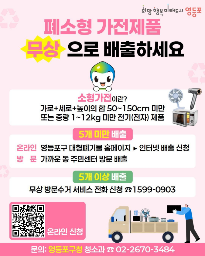 집 정리하다 보면 "이거 버려야 하는데...어떻게 버리지?" 이런 고민 한 번쯤 해보셨죠?🤔 특히 선풍기, 전자레인지, 드라이기 같은 애매한 소형 가전제품은 더 헷갈리기 마련인데요! 이제는 고민 NO ❌ 무상으로 간편하게 배출 할 수 있습니다🙌🏻♻️ 소형가전, 어디까지 가능할까? 가로+세로+높이의 합 50 ~ 150cm 미만 또는 중량 1 ~ 12kg 미만 전기(전자...
