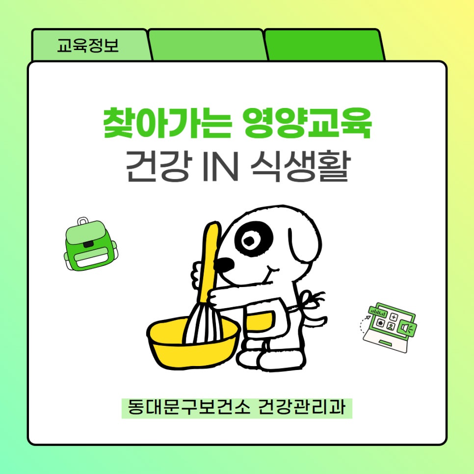 <찾아가는 건강 in 식생활> 4월 프로그램 단짠단짠, 단맛과 짠맛에 중독된 현대인들의 건강을 위해🧁 동대문구보건소에서 <찾아가는 건강 in 식생활> 교육을 시작합니다!🍌 모집대상 동대문구 거주 주민 누구나 🍌 교육일정 ✔ 1차 교육 4. 16.(목) 14:00 ~ 15:30 - 나의 짠맛 바로알기, 천연 다시팩 만들기 ✔ 2차 교육 4. 22.(수) 14:00 ~...