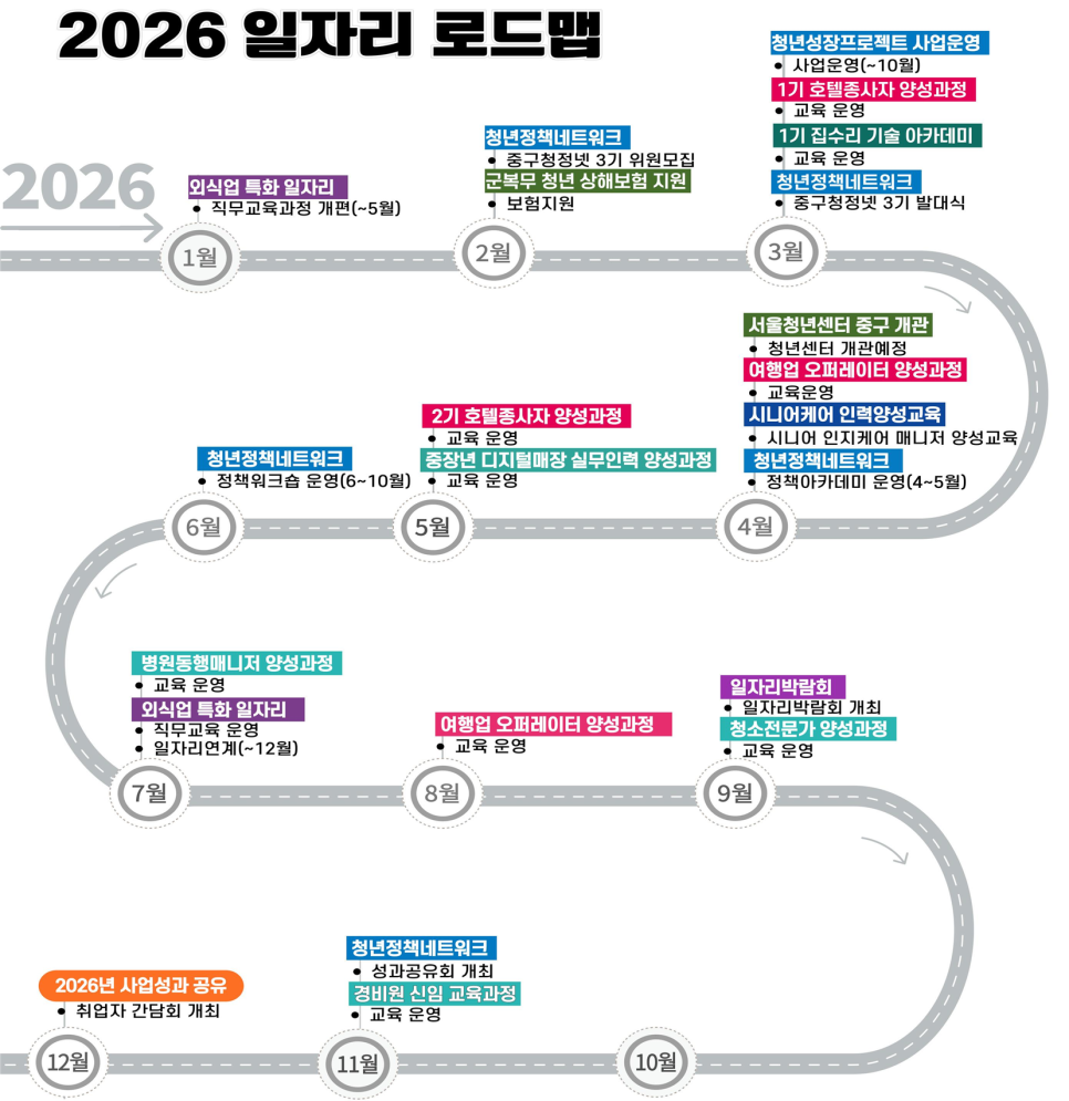 원하는 주민은 누구나 일할 수 있는 중구! 중구는 올해도 원하는 주민 누구나 일할 수 있는 환경을 만들기 위해 다양한 일자리 정책을 추진합니다 😊 지역 특성과 산업을 반영한 지속 가능한 일자리 창출을 통해 지역 경제를 활성화하고, 주민이 체감할 수 있는 맞춤형 일자리를 발굴·지원하여 안정적인 고용 환경을 만들어갈 예정입니다. 그럼 2026 일자리 로드맵 함께 보시죠! 😃 일자리...