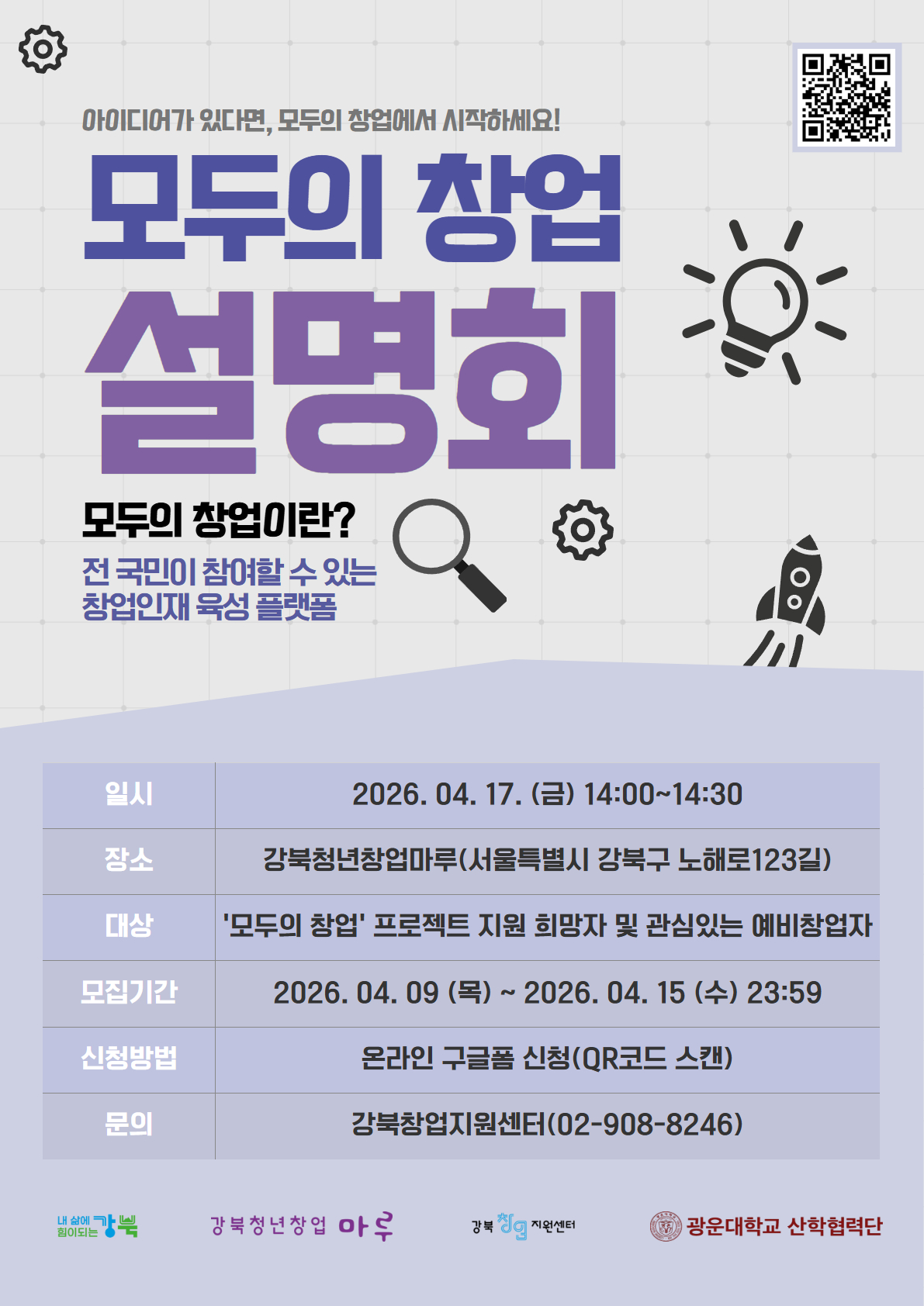 강북창업지원센터에서 '모두의 창업' 에 대한 설명회를 개최합니다. 모두의 창업이란 무엇인가? 및 Q&A 시간으로 알차게 구성할 예정이오니 (예비)창업자 및 초기 창업자 분들의 많은 참여 바랍니다 :-) <설명회 개요> ◦내용 : 모두의 창업 설명회 및 Q&A ◦일시 : 2026. 4. 17.(금) 14:00 ~ 14:30 (30분) ◦상담대상 : 모두의 창업 지원 희망자 및 관심있는 예비창업자 ◦상담인원 : 신청자 전원 선발 □ 신청 기간 ◦ 2026. 4. 15. (수) 까지 □ 장소 : 강북청년창업마루 (서울시 강북구 노해로23길 123) □ 참가비 ◦ 무료 □ 참가신청 https://forms.gle/MsjTC3ii34ZxgFmP9 □ 기타/유의사항 ◦ 센터 내 주차가 불가하므로 반드시 대중교통을 이용하여 방문하여 주시기 바랍니다. ◦ 주제 및 세부내용 변경될 수 있음 □ 문의처 ◦ 강북창업지원센터 : 02-908-8246