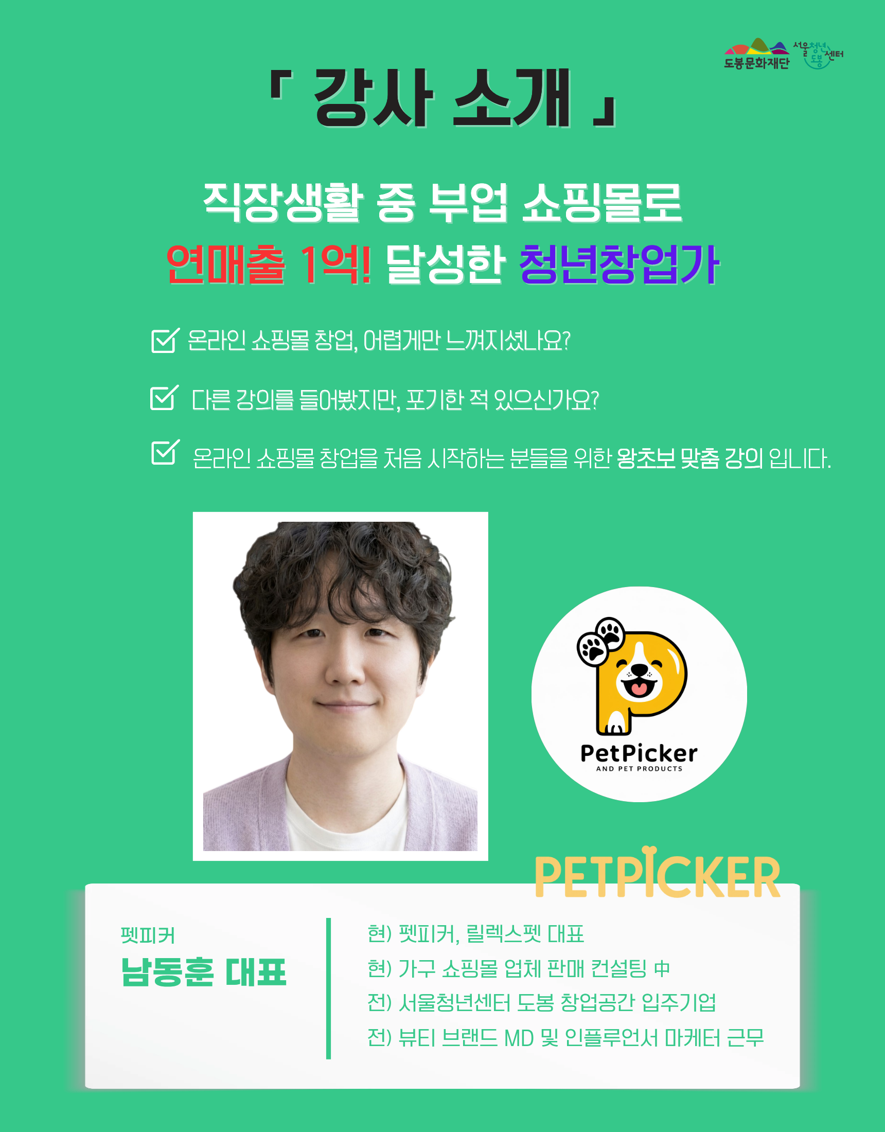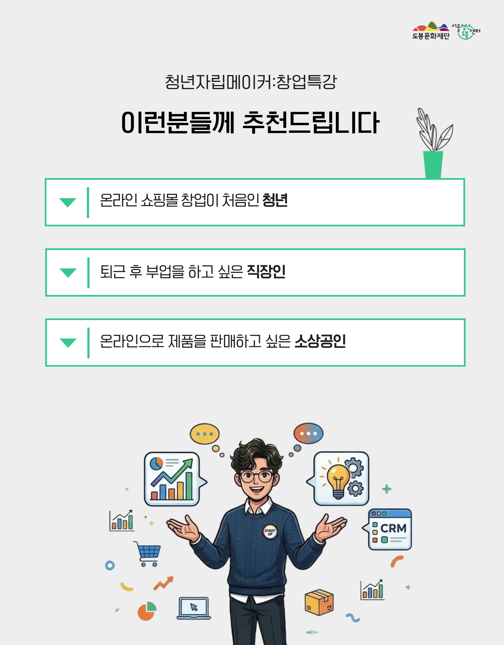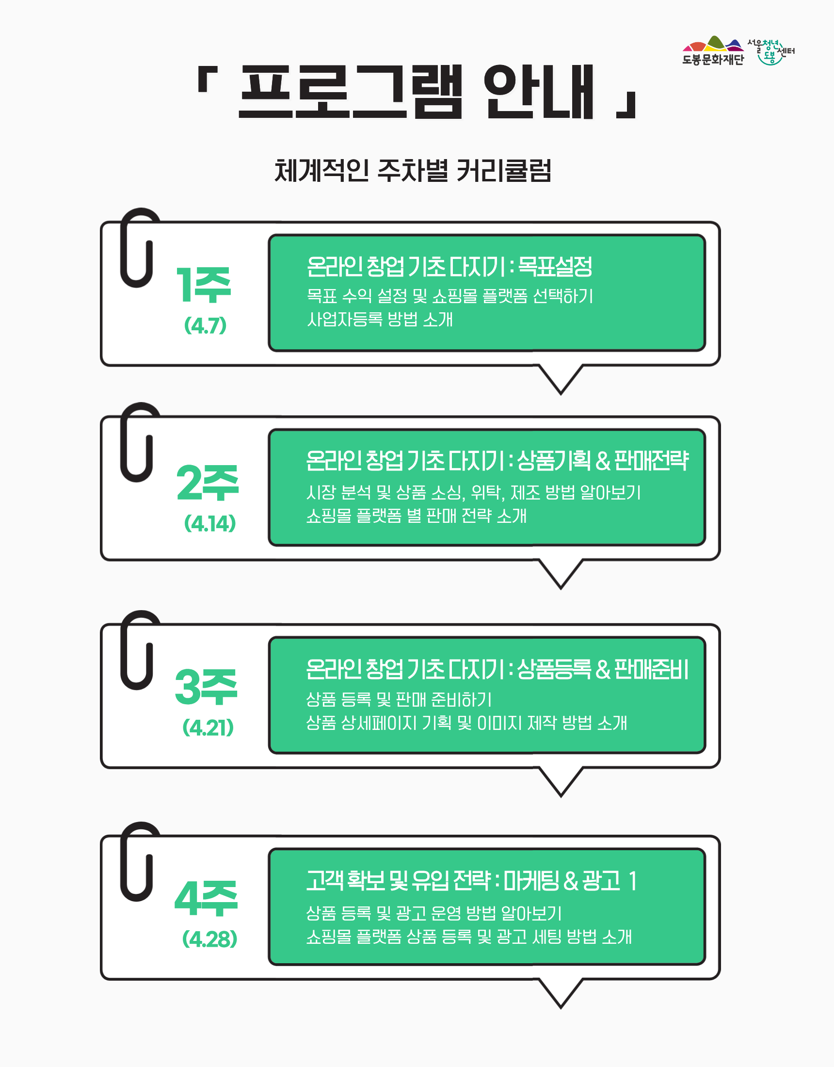안녕하세요. 서울청년센터 도봉 테일 매니저입니다. ⠀ 🎈 온라인 쇼핑몰 창업, 어렵게만 느껴지셨나요? 🎈 현재 시중에 있는 강의를 들어보려 했지만, 다른 이유로 포기한 적 있으신가요? ⠀ 본 강의는 온라인 쇼핑몰 창업을 처음 시작하는 분들을 위한 왕초보 맞춤 강의 입니다. ⠀ 또한 실제 실행해 볼 수 있도록 멘토링 프로그램까지 있는 "창.업.프.로.젝.트" 입니다. ⠀ 스마트스토어, 쿠팡 등의 온라인 쇼핑몰 개설부터 상품등록, 상품소싱전략, 판매준비, 마케팅 까지 단계별로 직접 실습하며 배워볼 수 있습니다👍 ⠀ ❤️모집대상 - 서울시 거주 또는 생활 (예비)청년창업가 (도봉구 기준 만19세~만45세) * 사업장소재지가 도봉구인 청년창업가 또는 도봉구 내 창업예정인 청년창업가 우선 선발 ⠀ ❤️진행일시 ✅ 창업 강의 : 4월~5월, 매주 화요일 19:00~21:00 (2개월) ✅ 전문 멘토링 : 6월~9월, 월 2회 정기 모임 (4개월) * 해당 강의는 강의(2개월) + 멘토링(4개월)으로 구성되어 있습니다. ⠀ ❤️프로그램 내용 ✅ 실전 창업 경험 : 온라인 쇼핑몰 개설부터 제품 판매 준비까지 직접 수행하는 프로젝트형 강의입니다. ✅ 사후 관리 : 단순 강의 종료로 끝내지 않고, 전문 멘토링과 주기적인 상담을 수행합니다. ✅ 추천 대상 : 사업자등록이 가능하며, 실무 판매 경험을 쌓고 싶은 분에게 추천합니다. ⠀ ❤️진행장소 - 서울청년센터 도봉 프로그램실 (서울시 도봉구 마들로 11길 75) ⠀ ❤️접수방법 - 26.03.19(목)~ 03.26(목) 23:59까지 구글폼으로 신청 → https://forms.gle/2ydSckCJonpX1QM86 ⠀ ❤️선발안내 - 26.03.27(금) 14:00 이후 선발하여 개별 연락 예정 (전화or문자) ✅ 전화수신번호 : 070-8853-6557 ✅ 문자수신번호 : 02120 * 신청인원 초과 시 조기마감 될 수 있습니다. ⠀ ❤️문의 - 서울청년센터 도봉 테일 매니저 - 070-8853-6557 / tail@syc.seoul.kr