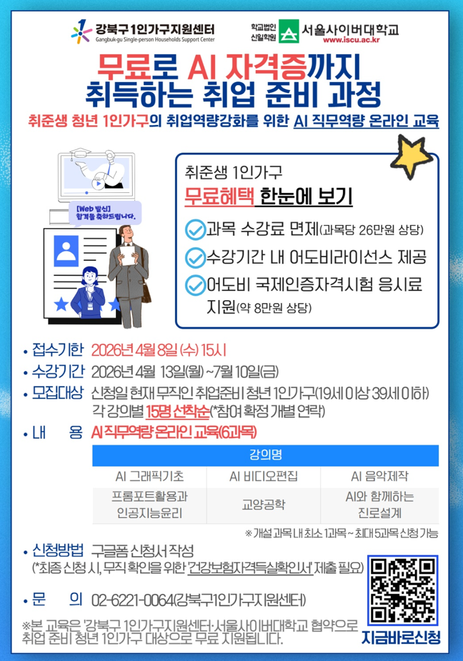 ※본 교육은 '강북구 1인가구지원센터&서울사이버대학교' 협약으로 취업 준비 청년 1인가구(만 19세 이상 39세 이하) 대상으로 무료 지원됩니다. ★무료로 AI 자격증까지 취득할 수 있는 기회! 취업을 준비하는 청년 1인가구를 위한 AI 직무역량 강화 온라인 교육 과정이 열립니다. 이번 과정은 단순 교육이 아니라, 실무 활용 가능한 AI 기술 + 자격증 취득까지 지원하는 프로그램입니다. ★이런 분들께 추천합니다 ✔ 취업 준비 중인 청년 ✔ AI, 디자인, 영상 분야에 관심 있는 분 ✔ 실무 역량을 빠르게 키우고 싶은 분 ★주요 혜택 ✔ 전 과목 수강료 무료 (과목당 약 26만원 상당) ✔ 교육 기간 동안 어도비 라이선스 제공 ✔ 어도비 국제인증 자격시험 응시료 지원 ★ 교육 과정 (6과목) AI 그래픽 기초, AI 비디오 편집, AI 음악 제작 , 프롬프트 활용 & 인공지능 윤리 , 교양공학 , AI 기반 진로 설계 => 1명 당 최소 1과목 ~ 최대 5과목 선택 가능 ★모집 대상 취업 준비 중인 청년 1인가구 (19~39세) / 선착순 15명 ★ 일정 - 접수 마감: 2026년 4월 8일(수) 15시 - 교육 기간: 2026년 4월 13일 ~ 7월 10일 ★ 신청 방법 구글폼 신청 (포스터 QR코드 확인) https://forms.gle/UvXgbjWXWFuUVCqy6 ★ 문의 02-6221-0064 (강북구 1인가구지원센터) ※본 교육 참여 최종 신청 시, 무직 확인을 위한 '건강보험득실확인서' 제출이 필요합니다.