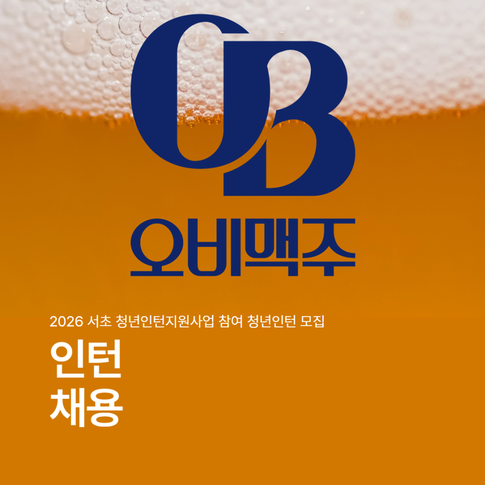 인턴채용2026 서초 청년인턴지원사업 참여 청년인턴 모집 오비맥주 물류팀에서 인턴으로 일할 미취업 서초청년을 모집합니다!!! ※채용공고문 꼭. 확인하세요※ · 채용분야 오비맥주 물류팀 7명(인턴) · 근무기간 3개월(2026년 3,4월~5,6월 중) ※우수자에 따라 3개월 연장할 수 있음 · 근무지 오비맥주 본사(서울시 강남구 영동대로517, 아셈타워)AS...