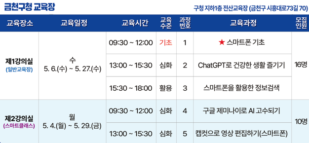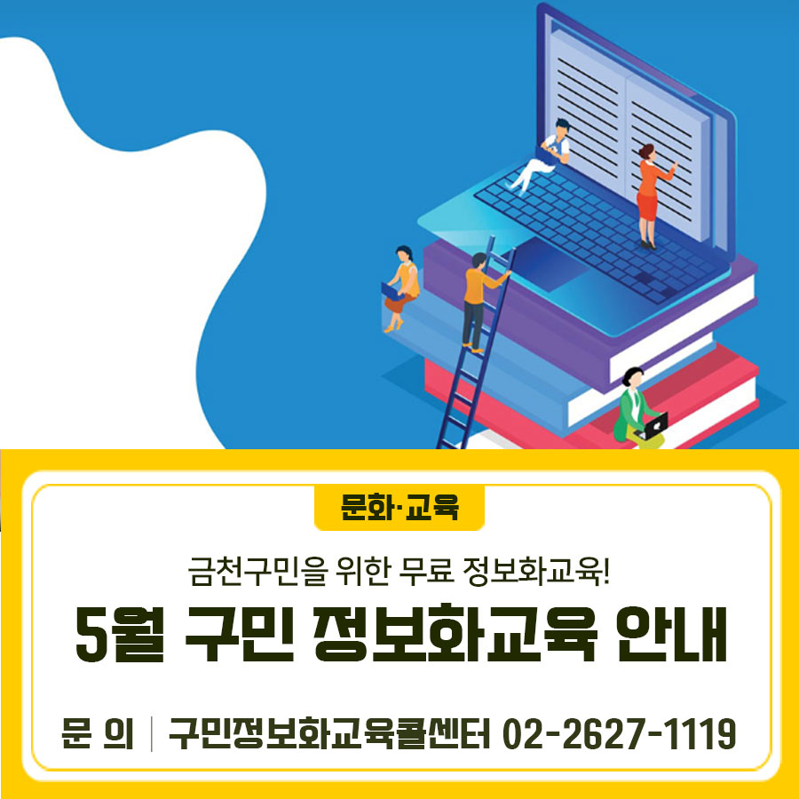 디지털 시대! 생활에 즐거움을 드리는 맞춤형 정보화 교육 5월 프로그램 안내드려요...💚 2026년 5월 구민 정보화 교육 안내 신청 기간: 4. 27.(월) 14시 ~ 4. 29.(수) 18시 * 교육 선정 문자 발송: 4.30.(목) 16시 이후 * 추가 접수 기간: 4.30.(목) 14시 ~ 18시 (추가 접수는 전화 접수만 가능, 선착순) 교육 대상: 주민등록상 금천구민 * 선발 기준: 전...