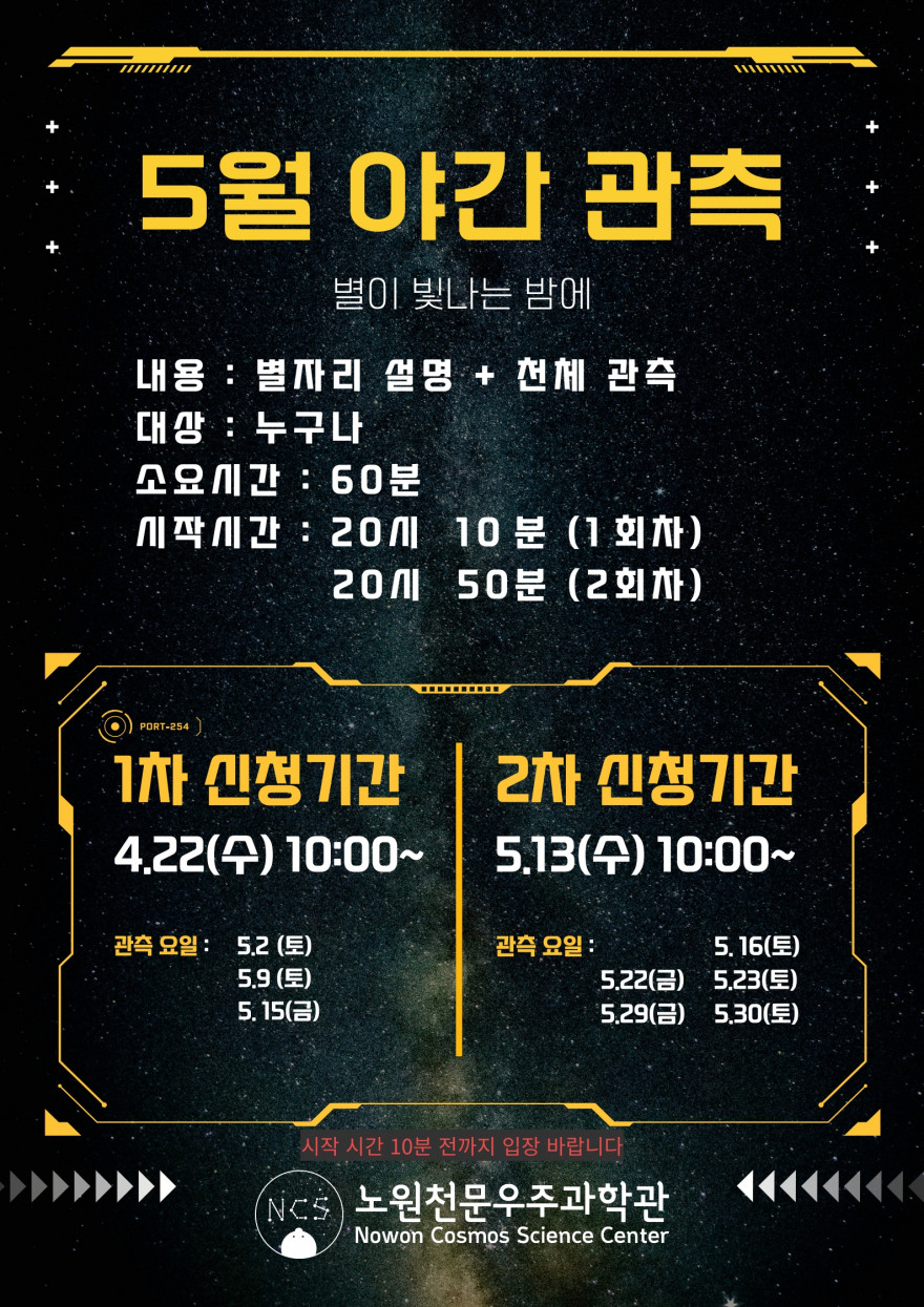 노원천문우주과학관 <5월 야간관측 - 별이 빛나는 밤에> 🔭내용 별자리 설명+천체관측 🔭대상 누구나 🔭소요시간 60분 🔭시작시간 20시 10분(1회차) 20시 50분(2회차) 🔭신청기간 1차 : 4.22(수) 10:00~ 관측요일 : 5.2(토), 5.9(토), 5.15(금) 2차 : 5.13(수) 10:00~ 관측요일 : 5.16(토), 5.22(금), 5.23(토), 5.29(금), 5.30(토) 🔭참가비 성인 2,000원|6세 이상 1,000원 🔭신청방법 노원천문우주과학관 홈페이지