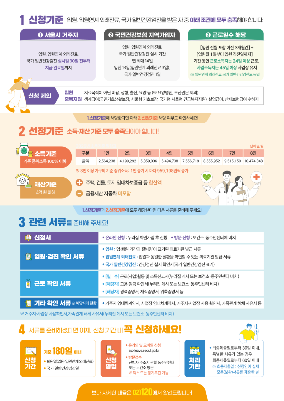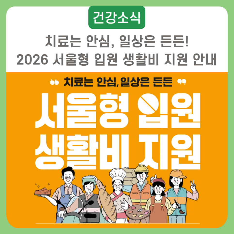 [건강소식] 치료는 안심, 일상은 든든! 2026 서울형 입원 생활비 지원 안내 문의 : 120다산콜 (☎ 02-120) 서울형 입원 생활비 지원은 질병·부상으로 아파도 치료 받지 못하는 일용직·이동노동자·프리랜서, 아르바이트생, 1인 소상공인, 근로취약계층에게 입원, 국가 일반건강검진 기간 동안 소득보장 차원의 수당을 지급해드리는 제도입니다. 질병 완화와 합병증을 예방...