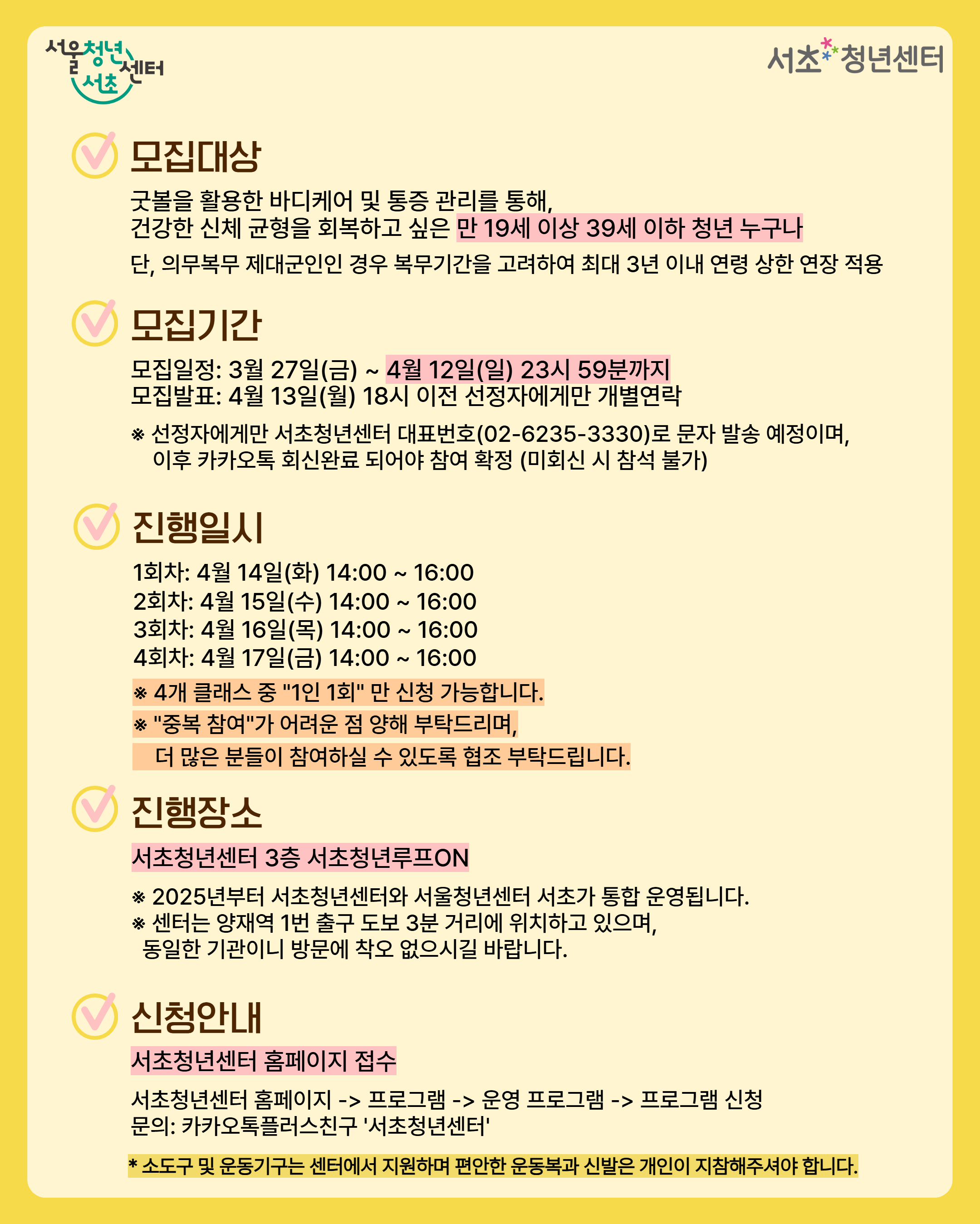 [루프ON 청년ON - 굿볼 참가자 모집] 🧘♂️ 📌 서울청년센터 서초 & 서초청년센터 3층 서초청년루프ON에서 굿볼로 몸의 움직임 이해하기 ! <프로그램 내용> 4/14(월): 굿볼을 활용한 상체 해방 4/15(화): 굿볼을 활용한 중심 재정렬 4/16(수): 굿볼을 활용한 감각적 이완 4/17(목): 굿볼을 활용한 실루엣 정렬 <모집 안내> ✨ 모집대상: 굿볼을 활용한 바디케어 및 통증관리를 통해, 건강한 신체 균형을 회복하고 싶은 만 19세 이상 39세 이하 청년 누구나 (의무복무 제대 군인은 최대 3년 이내 상한 연장 적용) 📅 모집 기간: 2026. 3. 27.(금) ~ 4. 12.(일) 23:59까지 ⏰ 참여 일시: 4/14(화), 4/15(수), 4/16(목), 4/17(금) 14:00~16:00 (총 4회) 📢 선정 발표: 4. 13.(월) 18:00 이전 선정자에게만 개별 연락 <신청 및 문의> 📝 신청방법: 서초청년센터 홈페이지 접수 https://www.seochoyc.org/sub_program/operate_view.php?idx=305 💬 문의: 카카오톡 플러스친구 '서초청년센터' *소도구 및 운동기구는 센터에서 지원하며, 편안한 운동복과 신발은 개인이 지참해 주셔야 합니다. *행사 중 촬영된 사진·영상은 홍보 목적으로 활용될 수 있습니다. *2025년부터 서초청년센터와 서울청년센터 서초가 통합 운영됩니다. 센터는 양재역 1번 출구 5분 거리에 위치하고 있으며, 동일한 기관이니 방문에 착오 없으시길 바랍니다.