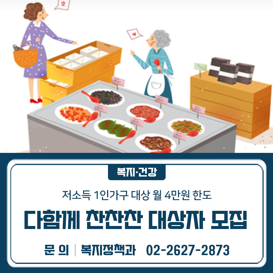 혼자여도 따뜻한 식사를 지원합니다🥄 저소득 중장년 1인가구를 위한「다함께 찬찬찬」 참여자를 모집합니다. 신청기간 2026. 4. 20.(월) ~ 4. 30.(목) (9일간) 신청방법 신청인의 주민등록 상동 주민센터 방문 신청 지원대상 저소득 중장년 [50세(1976년) ~ 64세(1962년)] 1인가구 선정인원 800명 지원기간 2026. 7월 ~ 12월 (6개월) 지원내용 바우처 카드...