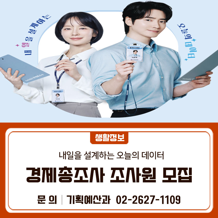 2025년 기준 경제총조사 조사요원을 모집합니다. 경제총조사란 무엇인가요? 산업 전반의 구조와 분포를 파악하기 위해 전국의 모든 사업체를 대상으로 5년마다 실시되는 조사입니다. 자격요건 - 만 18세 이상으로 - 조사기간 중 사업체 방문조사 등 업무 수행이 원활한 자 채용규모 - 88명(조사원) 주요업무 - 조사대상 사업체 방문을 통한 조사 실시 등 심사방법 - 서류심사 및 약식면접 접수기간 - (비...)