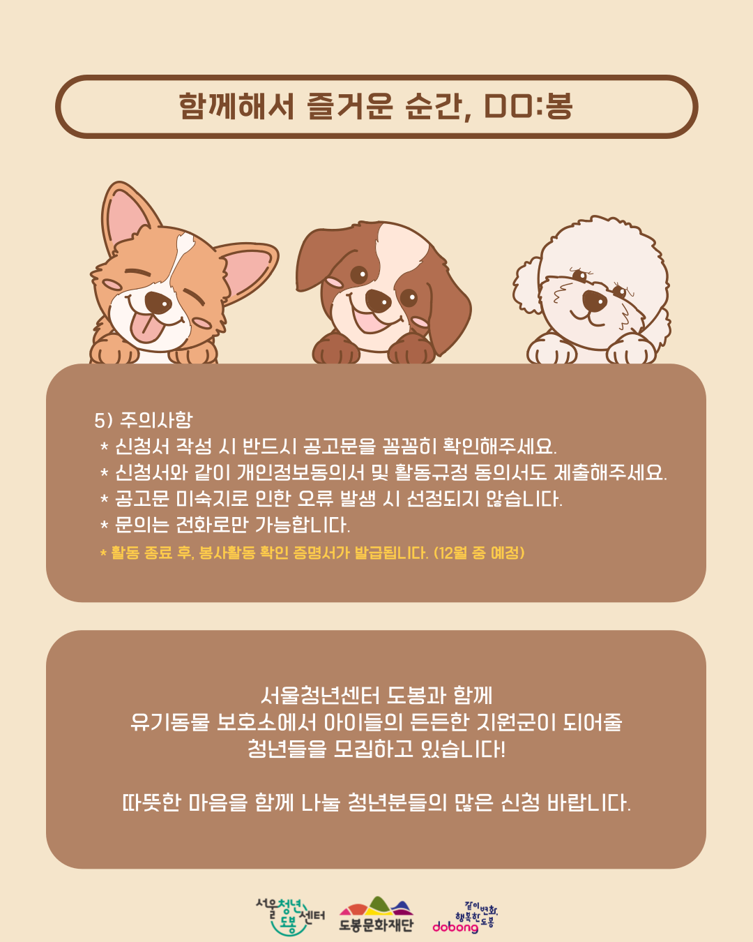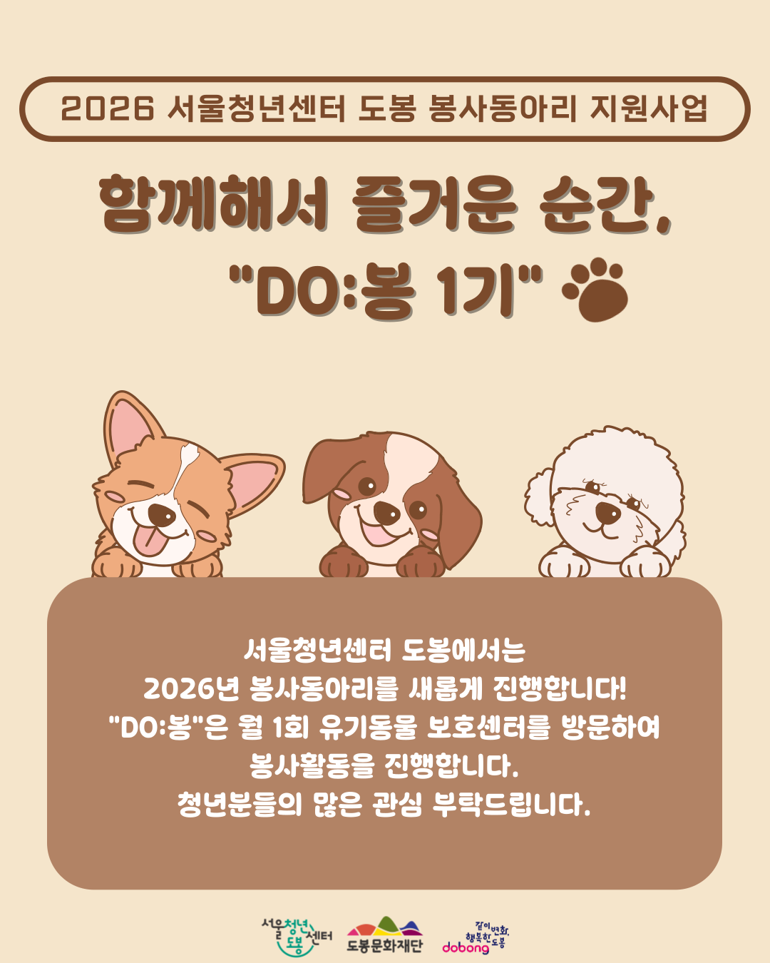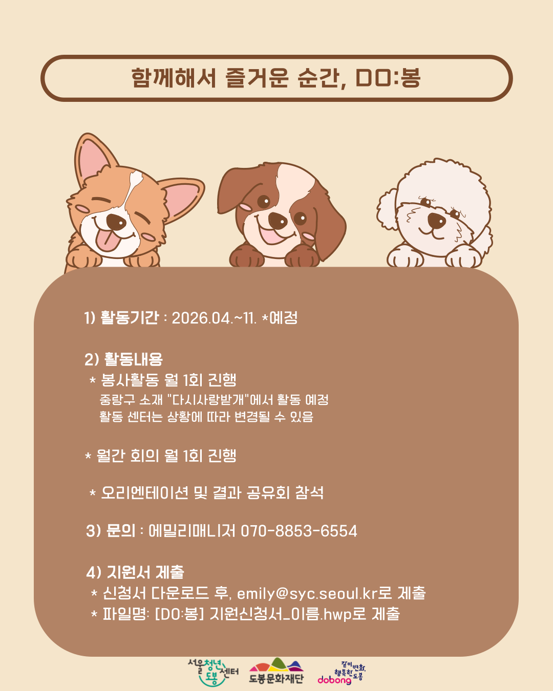 안녕하세요, 에밀리매니저입니다👩🦰 2026년 새롭게 시작되는 봉사동아리 "DO:봉"의 지원자 모집기간을 연장합니다! "DO:봉"은 지역 내 유기동물 보호센터를 방문하여 봉사활동을 진행합니다! 평소 유기동물 보호활동에 관심이 있는 청년분들의 많은 관심 부탁드립니다.📩 ▣ 모집대상: 도봉구 및 서울시 거주 청년 10명 (만 19세~39세) *도봉구 청년은 만45세까지 지원 가능 ▣ 모집기간: 2026.03.12.(목)~03.22.(일) *[DO:봉] 지원신청서_이름.hwp ▣ 서류발표: 2026.03.25.(수) 예정 ▣ 면접심사 및 발표: 2026.03.27.(금) / 2026.03.30.(월) 예정 ▣ 활동기간: 2026.04.~11. 예정 ▣ 활동내용 *월 1회 유기동물보호센터 방문하기 *월 1회 월간회의 진행 *활동종료 후, 봉사활동 확인서 발급 (12월 예정) ▣ 주의사항 *자세한 활동관련 내용 및 주의사항은 공고문 및 게시물을 반드시 확인 부탁드립니다. ▣ 문의: 에밀리 매니저 070-8853-6554 ▣ 지원서 제출: emily@syc.seoul.kr 공고문 : https://blog.naver.com/dborang/224213588063