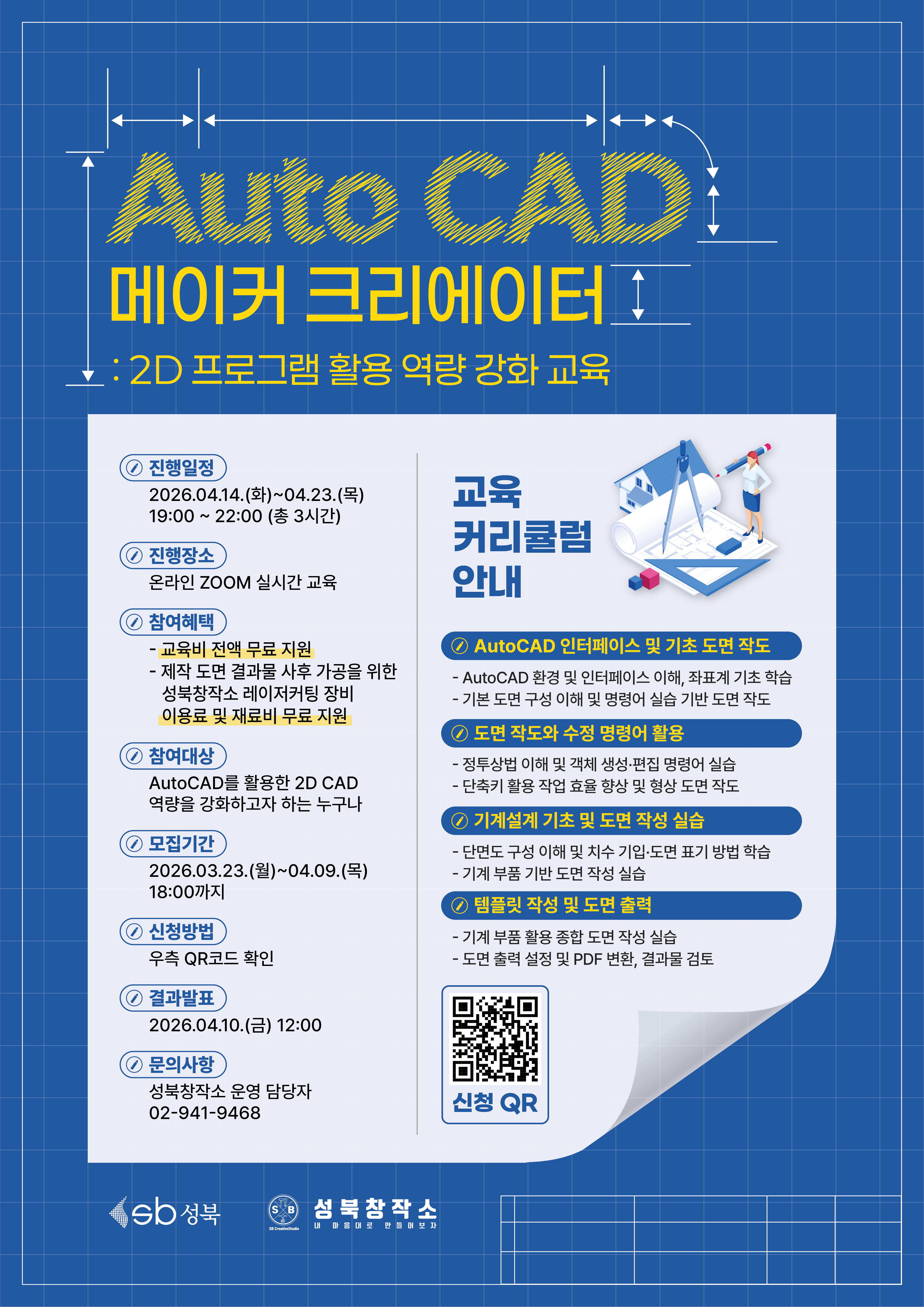 일 시 : 2026.4.14.(화)~4.23.(목) 19:00~22:00 장 소 : 온라인 ZOOM 실시간 교육 금 액 : 무료 모집기간 : 2026.3.23.(월) ~ 4.9(목) ~ 18:00 ※ 포스터 내의 QR코드 확인 문 의 : 성북창작소 담당자 02-941-9468