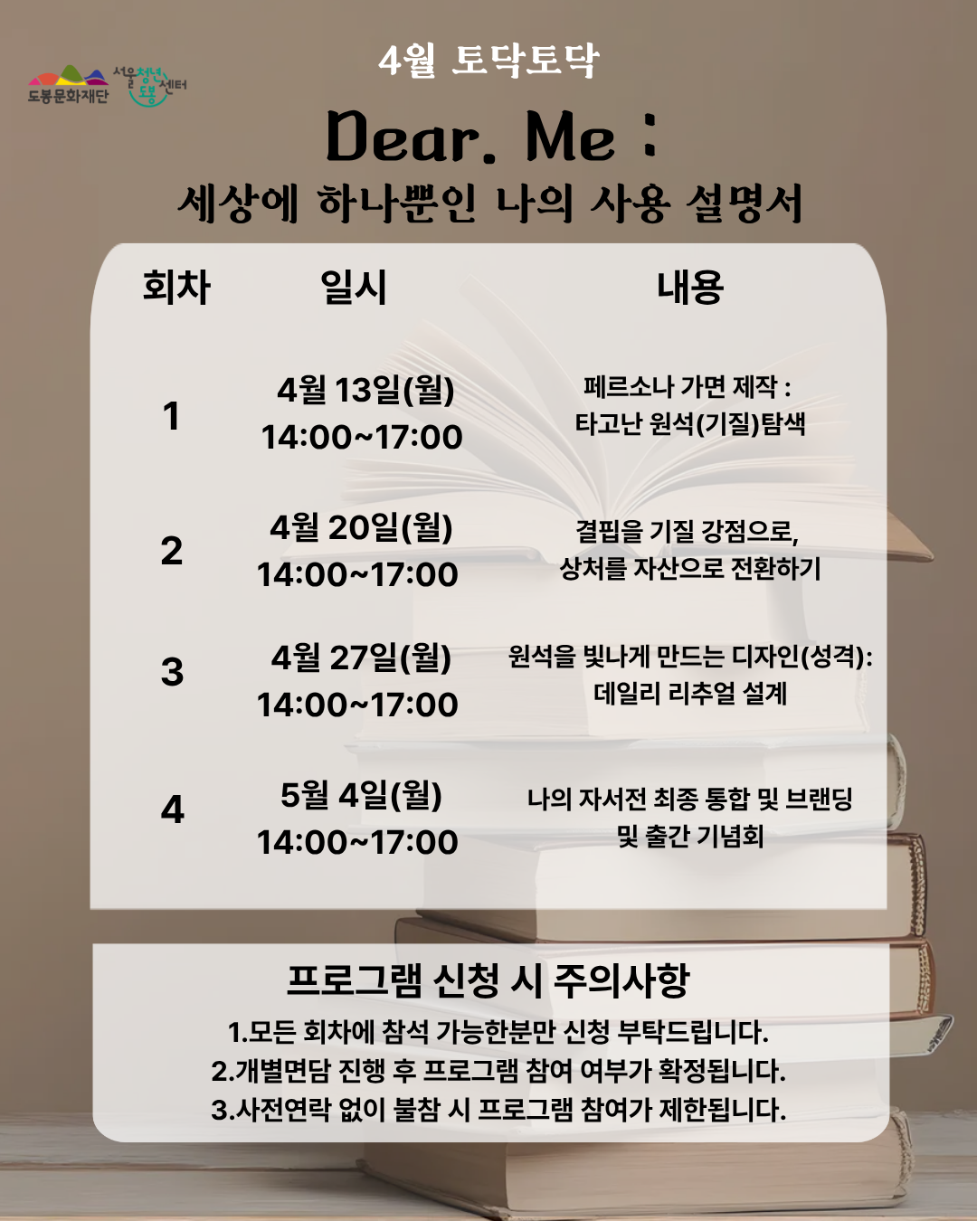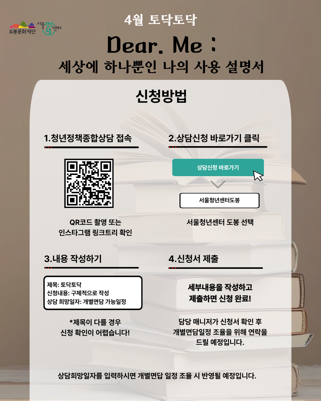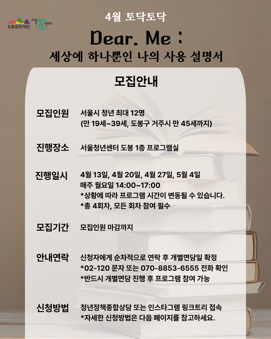안녕하세요. 서울청년센터 도봉 매니저 안나입니다!🤓 집단상담 ‘토닥토닥’ 4월 주제는 입니다. ’갓생(부지런한 삶)‘ 열풍 속에서 타인과 자신을 끊임없이 비교하며 ’진짜 나‘를 잃어버린 청년들에게 ’나만의 고유한 데이터(TCI)‘를 제공하며, 킨츠기(Kintsugi) 기법을 통해 나만의 귀한 문양으로 재해석하여 자존감을 회복합니다. 단순한 심리검사 결과지가 아닌, 소장하고 싶은 ’자서전‘을 완성함으로써 자기 탐색의 과정을 성취로 연결합니다. [4월 13일, 4월 20일, 4월 27일, 5월 4일 / 매주 월요일 14:00~17:00] 📢상황에 따라 프로그램 일정이 변동될 수 있습니다. 💗해당 프로그램은 전문 심리상담사와 함께 합니다. 📢[총 4회차]로 모든 회차에 참석 가능한 분만 신청해주세요. 📢개별면담 진행 후 집단상담 참여 여부가 확정됩니다. ✨모집대상 - 서울시 청년 최대 12명 (만 19세~35세, 도봉구 거주시 만 45세까지) ✨일시 - 1회차: 4/13(월) 14:00~17:00 - 2회차: 4/20(월) 14:00~17:0 - 3회차: 4/27(월) 14:00~17:00 - 4회차: 5/4(월) 14:00~17:00 (동일 인원으로 4회차가 진행됩니다.) ✨장소 - 서울청년센터 도봉 1층 프로그램실 ✨접수 - 모집인원 마감까지 - 신청자에게 순차적으로 연락 후 개별면담일 확정 (02-120 문자 또는 070-8853-6555 유선전화 확인) - 하단 링크 접속 → https://youth.seoul.go.kr/crm/front/index.do 📢신청 시 제목에 ‘토닥토닥’이라고 작성해주셔야 합니다. 📢상담 희망일자를 개별면담 가능일(3/24~4/10 중 진행)로 설정해주세요. ✨문의 - 서울청년센터 도봉 안나 매니저 070-8853-6555 📌주의사항 (꼭 읽어주세요!) - 개별면담 진행 후 프로그램 참여 여부가 확정됩니다. - 신청자에게 순차적으로 연락 후 개별면담일이 확정됩니다. (02-120 문자 또는 070-8853-6555 유선전화 확인 必) - 30분 이상 지각 또는 사전 연락 없이 불참 시 프로그램 참여가 제한될 수 있습니다. - 진행 예정 시간은 3시간이나 상황에 따라 일찍 또는 늦게 종료될 수 있습니다.