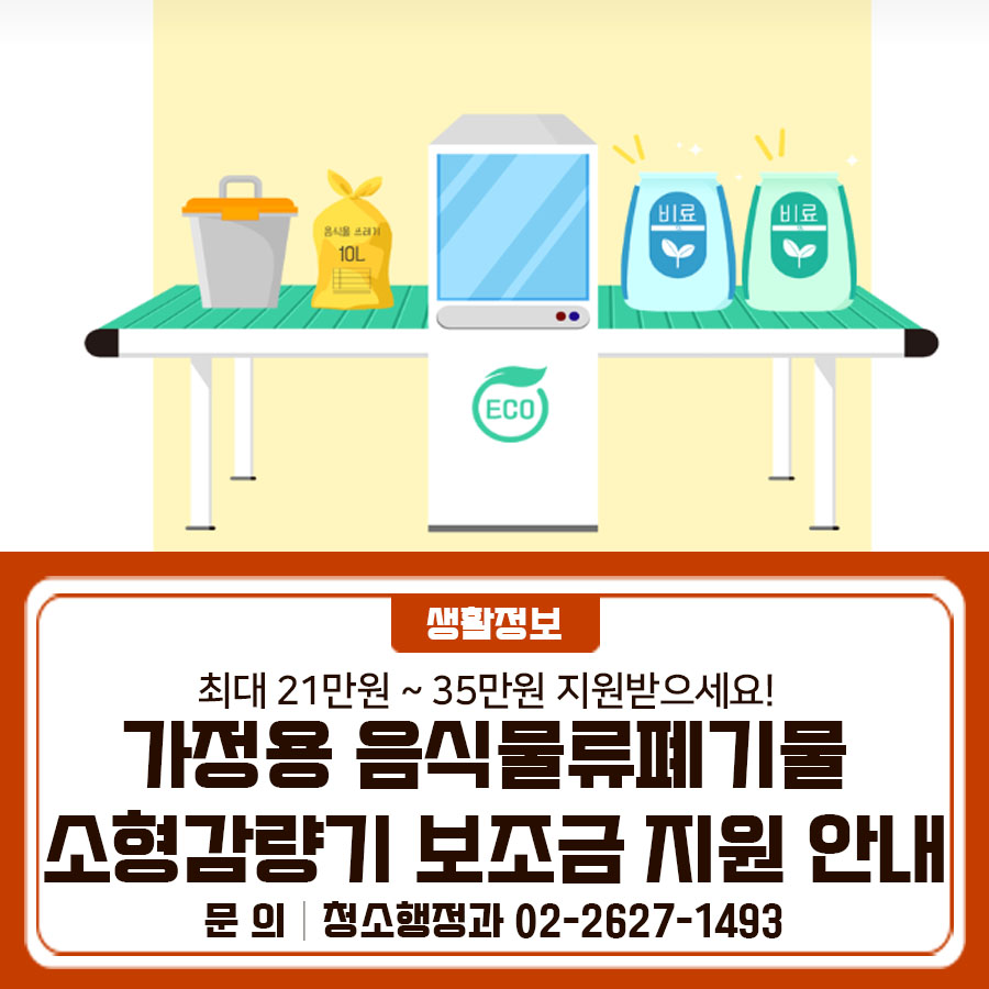 음식물처리기 구매 지원💸 금천구민이라면 신청 가능! 최대 21~35만원까지 지원됩니다. 선착순 마감, 지금 신청하세요✨ 지원대상 - 공고일(2026.3.23.)부터 보조금 지급 시까지 신청인의 주민등록상 거주지가 금천구이고 - 가정용 소형감량기를 구매‧설치한 금천구민(구매예정 포함) 신청방법 및 기간 [2026. 3. 30. ~ 4. 3.] 법정복지대상자 18세대(동주민...