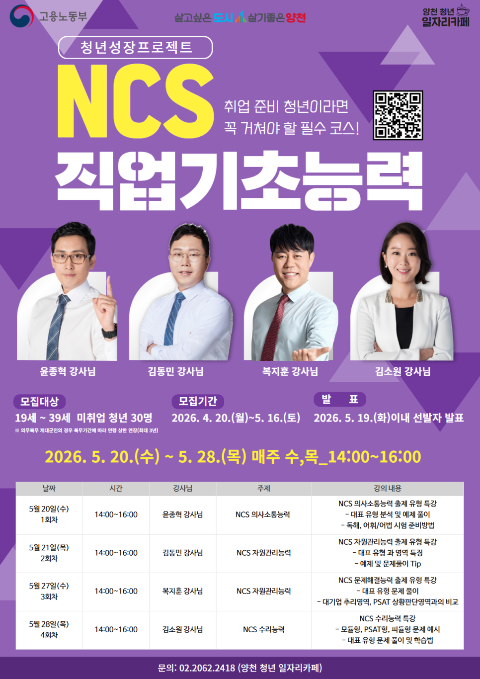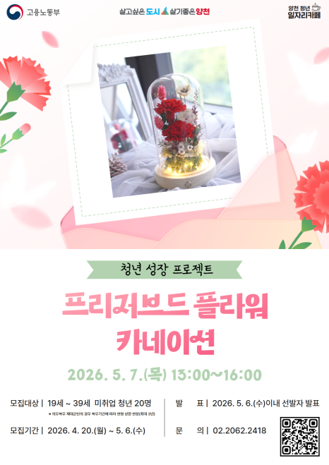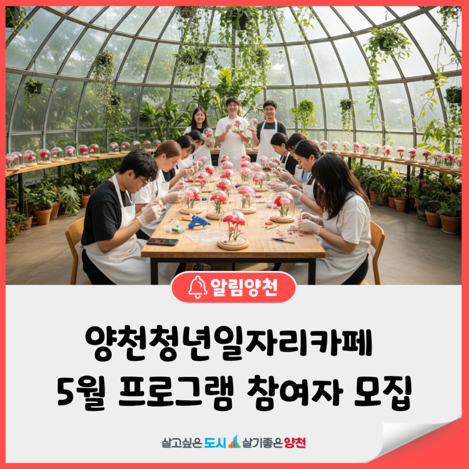 이미지를 누르면 사진이 커져요! 양천 청년 일자리카페는 취업을 준비하는 청년들을 대상으로 취업 컨설팅, 취업특강 등 다양한 취업준비 프로그램과 취업정보를 제공하는 청년취업준비 공간입니다. 5월 프로그램 참여자를 모집하니, 청년 구직자들의 많은 관심과 참여 바랍니다. 😄 ① 취업특강 - 근로자의 권리 참여대상: 19세 ~ 39세 미취업 청년 30명 * 청년고용정책 연계가 가능한...