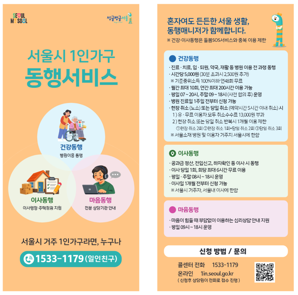 혼자여도 든든한 서울 생활동행매니저가 함께합니다. 씩씩하게 혼자 생활하다가 보면 가끔은 누군가의 도움이 필요할 때가 있습니다. 서울시 거주 1인이라면 누구나 도움 받으실 수 있는「서울시 1인가구 동행서비스」 혼자여도 든든한 서울생활을 위해 동행매니저가 함께 합니다. ✅ 동행서비스 건강동행※서울소재 병원에 한함 🔹진료·치료, 입·퇴원, 약국, 재활 등 병원 이용 전 과정...