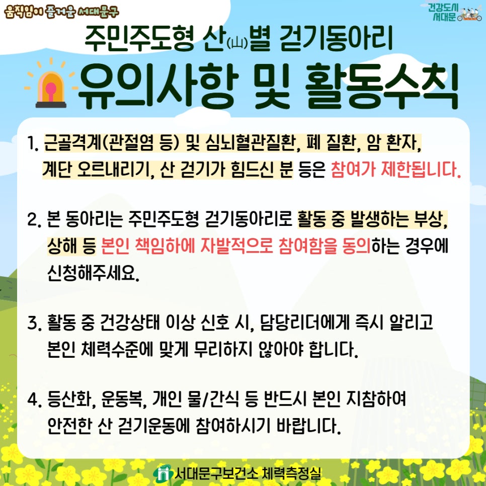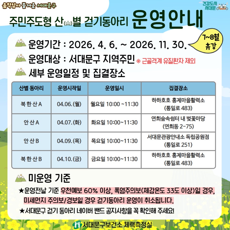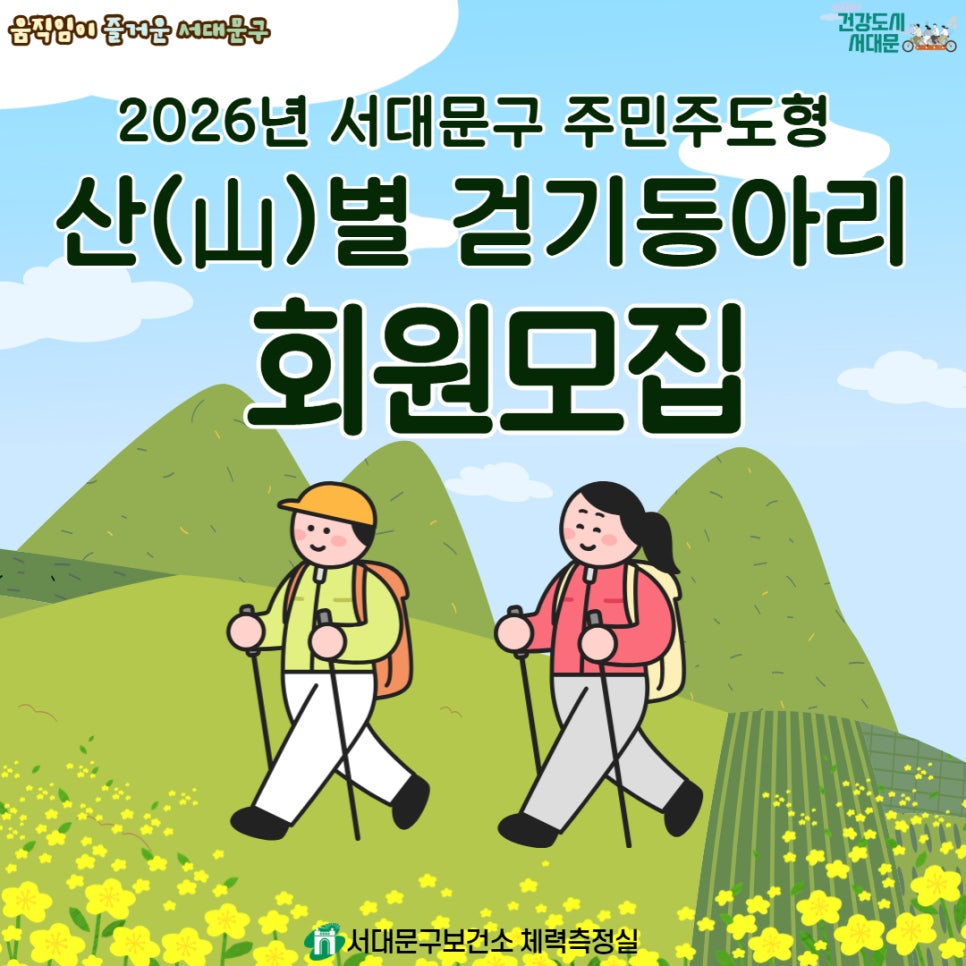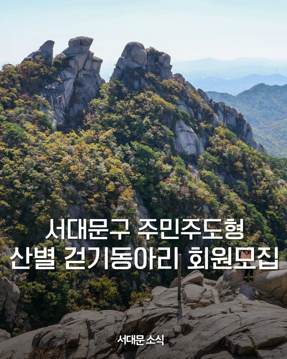 ⛰️ 서대문구 주민주도형 산(山)별 걷기 동아리 회원 모집 혼자 걷기보다 함께 걸으면 더 즐겁습니다! 이웃과 함께 건강한 습관을 만드는 서대문구 산별 걷기 동아리에 참여해보세요 🚶♀️🚶♂️ 📌 운영기간 ✔ 2026. 4. 6. ~ 2026. 11. 30. ※ 7~8월 휴강 📌 운영대상 ✔ 서대문구 지역주민 ※ 근골격계 질환자 등 산 걷기가 어려운 경우 참여 제한 📍 산...