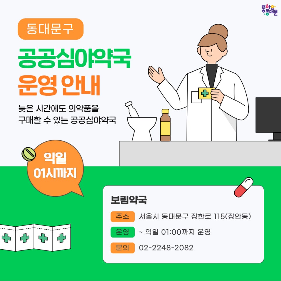 심야시간대 의약품 구매를 위해 동대문구에서 공공심야약국을 운영합니다 ! ◆공공심야약국 운영 -약국명 : 보림약국 -주소 : 서울 동대문구 장한로 115 -운영 : ~익일 01:00까지 -문의 : 보림약국 02-2248-2082