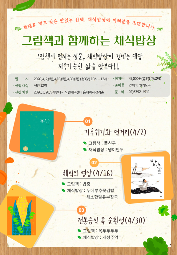 노원에코센터 <그림책과 함께하는 채식밥상> 그림책이 던지는 질문, 채식밥상이 건네는 대답 지속가능한 삶을 맛보다! 제대로 먹고 싶은 맛있는 선택, 채식밥상에 여러분을 초대합니다. 일 시 : 4월2일~4월30일 (총3강) 10시~13시(목) 장 소 : 노원에코센터 대 상 : 성인 12명 준비물 : 앞치마, 필기도구 참가비 : 45,000원 (총3강 재료비) 신 청 : 3.20(목) 9시부터 노원에코센터 홈페이지 선착순 접수