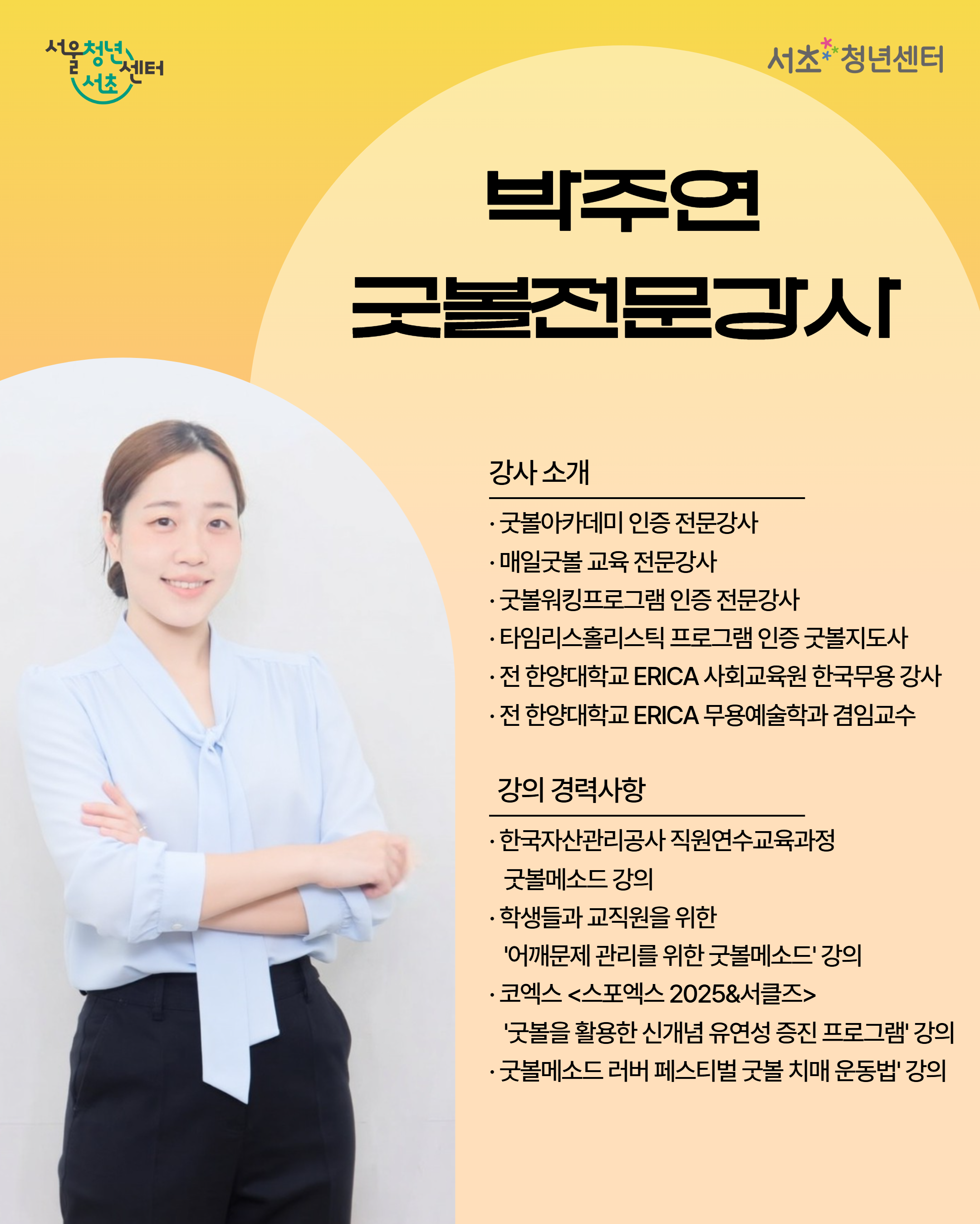 [루프ON 청년ON - 굿볼 참가자 모집] 🧘♂️ 📌 서울청년센터 서초 & 서초청년센터 3층 서초청년루프ON에서 굿볼로 몸의 움직임 이해하기 ! <프로그램 내용> 4/14(월): 굿볼을 활용한 상체 해방 4/15(화): 굿볼을 활용한 중심 재정렬 4/16(수): 굿볼을 활용한 감각적 이완 4/17(목): 굿볼을 활용한 실루엣 정렬 <모집 안내> ✨ 모집대상: 굿볼을 활용한 바디케어 및 통증관리를 통해, 건강한 신체 균형을 회복하고 싶은 만 19세 이상 39세 이하 청년 누구나 (의무복무 제대 군인은 최대 3년 이내 상한 연장 적용) 📅 모집 기간: 2026. 3. 27.(금) ~ 4. 12.(일) 23:59까지 ⏰ 참여 일시: 4/14(화), 4/15(수), 4/16(목), 4/17(금) 14:00~16:00 (총 4회) 📢 선정 발표: 4. 13.(월) 18:00 이전 선정자에게만 개별 연락 <신청 및 문의> 📝 신청방법: 서초청년센터 홈페이지 접수 https://www.seochoyc.org/sub_program/operate_view.php?idx=305 💬 문의: 카카오톡 플러스친구 '서초청년센터' *소도구 및 운동기구는 센터에서 지원하며, 편안한 운동복과 신발은 개인이 지참해 주셔야 합니다. *행사 중 촬영된 사진·영상은 홍보 목적으로 활용될 수 있습니다. *2025년부터 서초청년센터와 서울청년센터 서초가 통합 운영됩니다. 센터는 양재역 1번 출구 5분 거리에 위치하고 있으며, 동일한 기관이니 방문에 착오 없으시길 바랍니다.