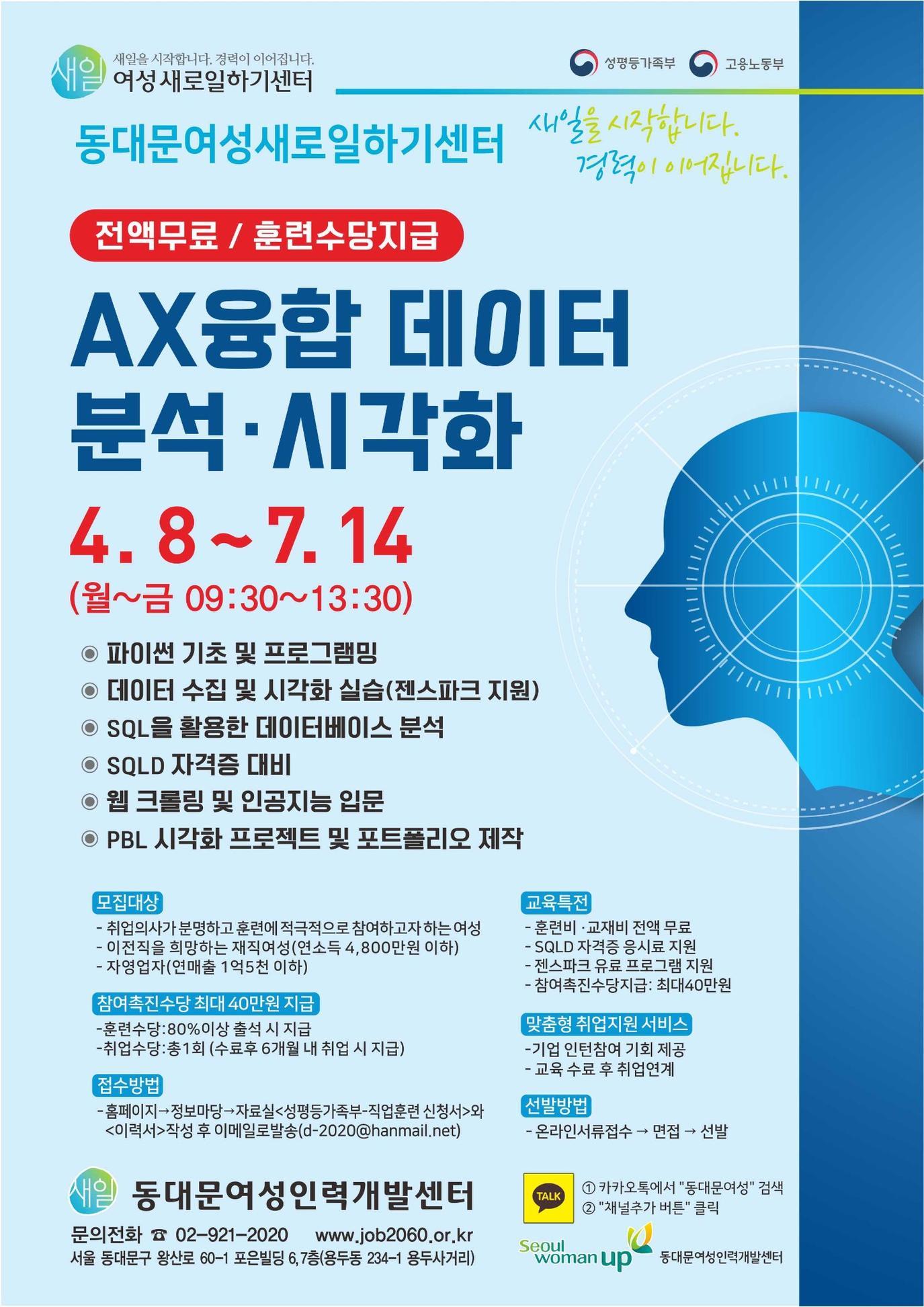 [국비무료]AX융합 데이터 분석·시각화 훈련생 모집 ■ 훈련목표 파이썬 기반으로 데이터 수집·분석·시각화, 데이터베이스 및 기초 AI를 학습하는 실무 중심 데이터 교육과정입니다. SQLD 자격 취득과 포트폴리오 제작을 통해 비전공자·취업준비생의 데이터·공공데이터 직무 취업을 지원합니다. ■ 교육특전 -교육비, 교재비 무료 -훈련수당(최대40만원) -젠스파크 유료 프로그램 지원 -SQLD 자격증 응시료 지원 -수료 후 취업알선 ■ 교육기간 2026.4.8[수] ∼ 2026.7.14[화] / 월∼금[총65일/260시간] 9:30∼13:30 **교육신청기간 : ∼ 4월 3일까지 [pm 14:00까지] ■ 취업전망 공공기관, 금융사, 광고대행사, 온라인쇼핑몰, 웹크로링 기반 리서치 업체 등 데이터 분석 및 데이터 담당자로 취업 가능 ■ 교육내용 1) 파이썬 기초 및 프로그램밍 2) 데이터 수집 및 시각화 실습 3) SQL을 활용한 데이터베이스 분석(젠스파크 지원) 4) SQLD 자격증 대비 5) 웹 크롤링 및 인공지능 입문 6) PBL 시각화 프로젝트 및 포트폴리오 제작 ■ 접수방법 홈페이지 서식자료실에서 참가신청서, 이력서를 이메일로 제출(d-2020@hanmail.net) 온라인서류접수→면접→최종합격 ■ 교육 신청 및 문의 https://zrr.kr/uQPUt5 전화문의 02-921-2020