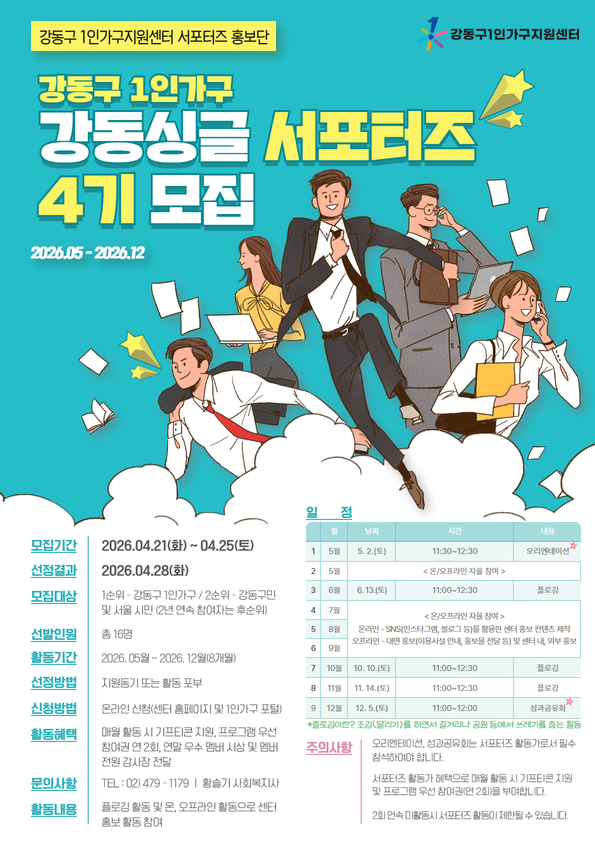안녕하세요! 강동구1인가구지원센터입니다:) 강동싱글 서포터즈 4기 모집! 센터를 함께 알리고, 의미 있는 활동에 참여할 강동구 1인가구지원센터 홍보단을 모집합니다 :) “홍보활동이라 어렵지 않을까?” 고민되신다면 걱정하지 않으셔도 됩니다! SNS가 어렵다면 오프라인 활동으로도 참여 가능하며, 함께 참여하는 플로깅 활동 등 부담 없이 참여 가능합니다 함께 만들어가는 강동구 1인가구, 같이 참여해보세요! 처음이신 분도 편하게 참여 가능합니다 매월 활동 시 다양한 혜택도 준비되어 있습니다 가볍게 시작해보세요! 자세한 내용은 홍보물을 참고해주세요