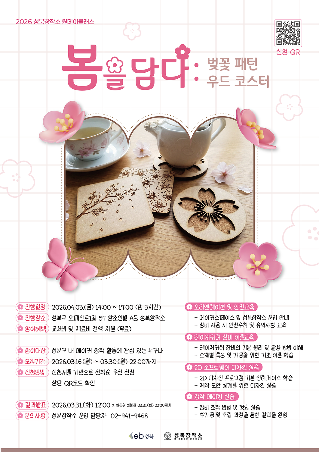 벚꽃 패턴 우드 코스터 만드는 무료 원데이 클래스, 4월 3일 성북창작소에서 열려! 3월 30일까지 신청하고 봄 감성 충전해봐.
