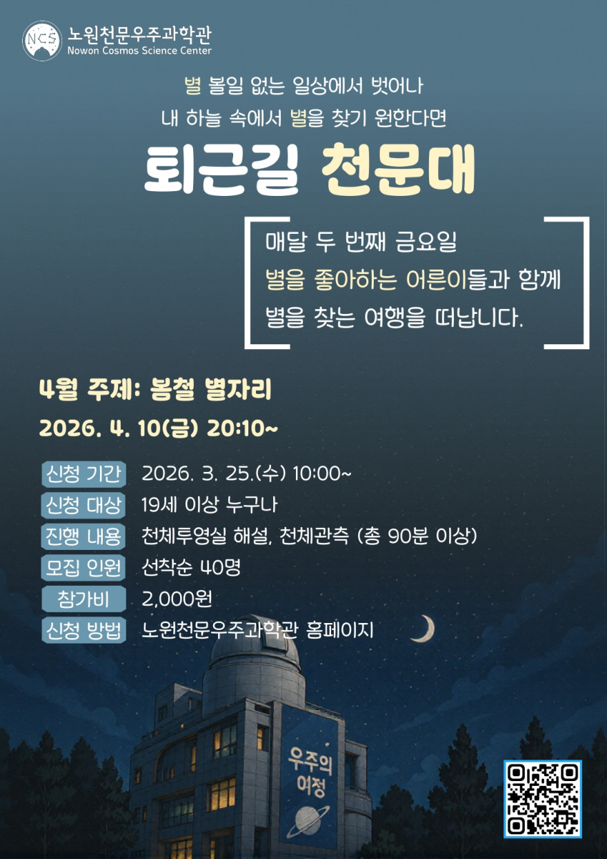 노원천문우주과학관 <4월 퇴근길 천문대> 별 볼일 없는 일상에서 벗어나 내 하늘 속에서 별을 찾기 원한다면 매달 두 번째 금요일 별을 좋아하는 어른이들과 함께 별을 찾는 여행을 떠납니다. 🌌4월 주제 봄철 별자리 🌌일정 2026.04.10.(금) 21:10~ 🌌신청기간 2026.03.25(수) 10:00~ 🌌신청대상 19세 이상 누구나 🌌진행 내용 천체투영실 해설, 천체관측(총 90분 이상) 🌌모집 인원 선착순 40명 🌌참가비 2000원 🌌신청방법 노원천문우주과학관 홈페이지